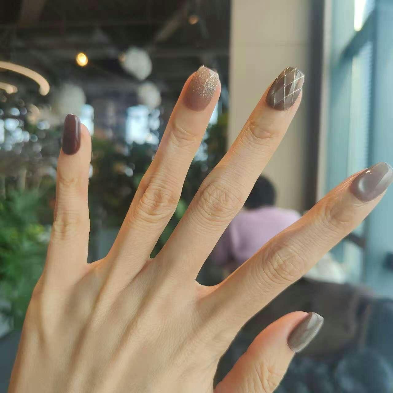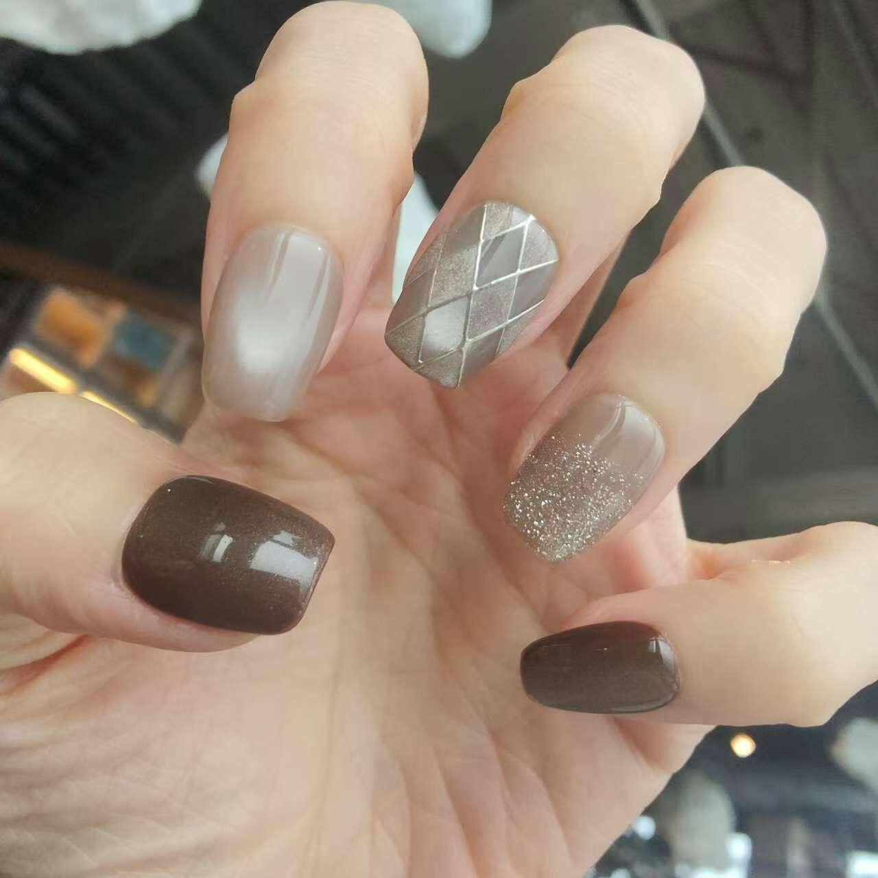 落ち着いたモカブラウンに繊細なキルティング模様を合わせた、上品で大人可愛いブラウンネイル。冬コーデやニュアンス系のファッションに自然に馴染む人気デザインです。