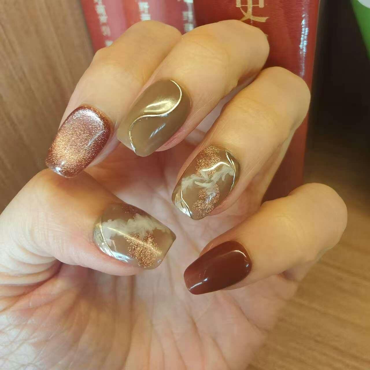 赤みブラウンにホワイトマーブルを重ねた、大人上品なニュアンスネイル。自然な光沢と控えめなメタリックラインが指先に奥行きを与え、オフィスにも普段使いにも馴染む万能カラーです。