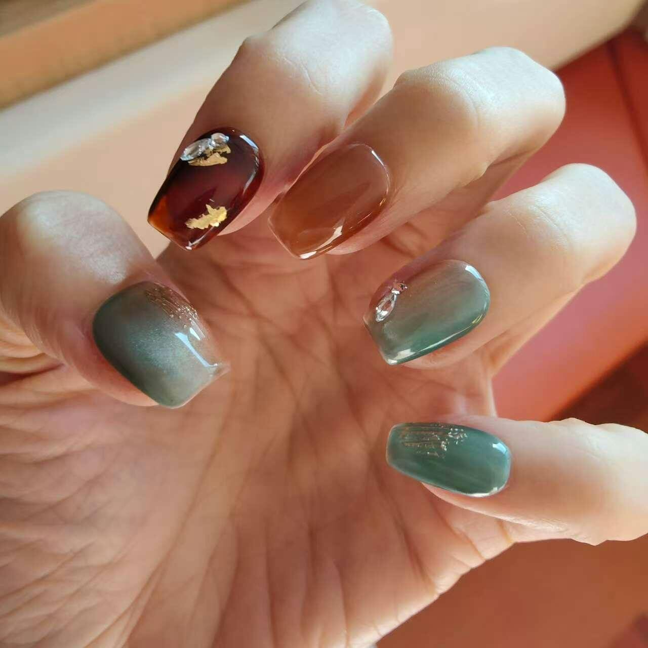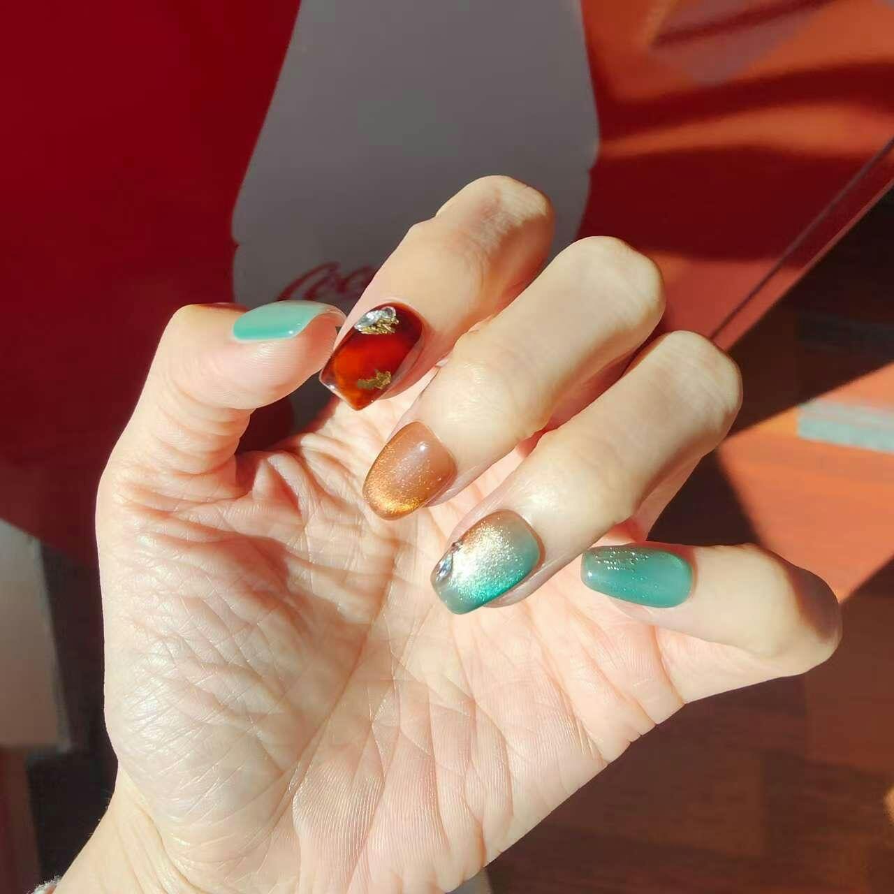 深みのあるエメラルドグリーンと、琥珀のように艶めくブラウンを組み合わせた大人ニュアンスネイル。