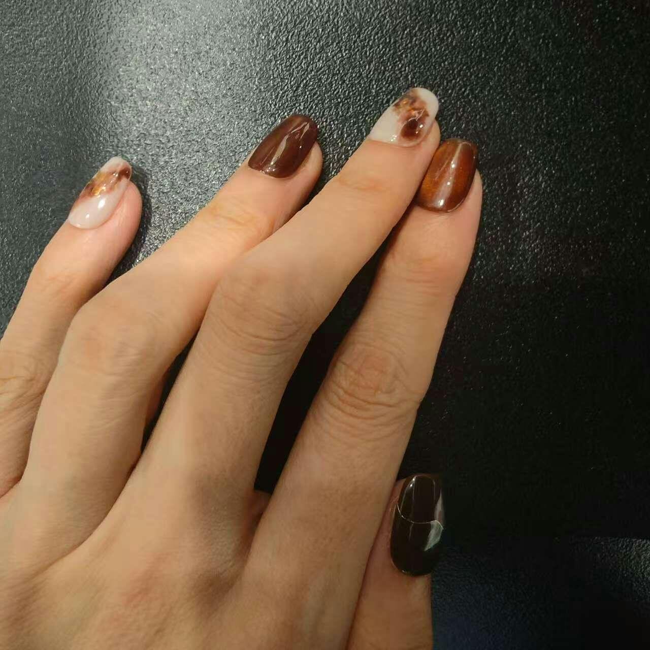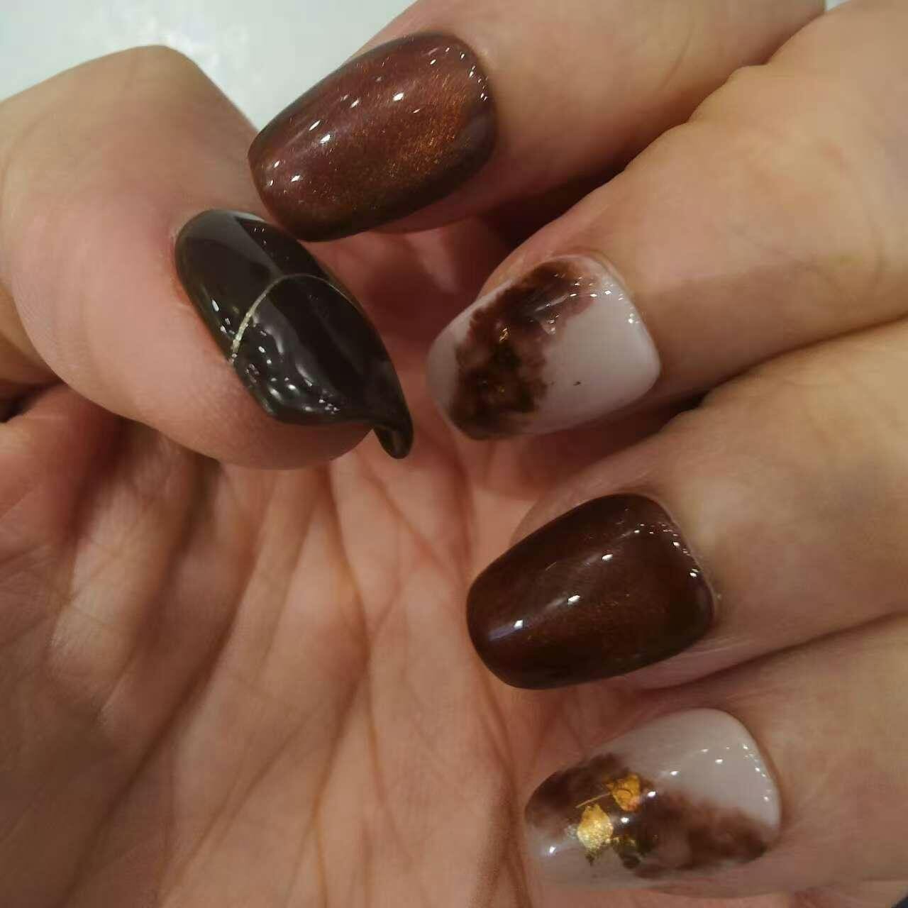 温かいコーヒーにミルクをそっと落とした瞬間の、ゆっくり広がる色の混ざり合いを表現しました。 濃淡のあるブラウンが指先に深みを与え、落ち着きの中に少しだけ気品を漂わせてくれます。