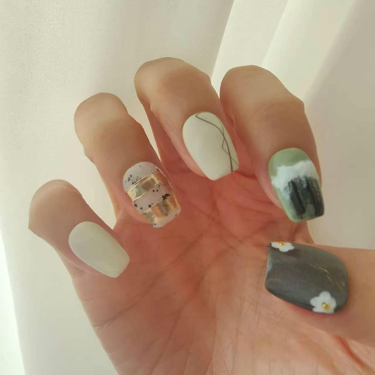 ひとつひとつ異なるアートが並んでいても、全体として美しく調和するよう“色の静と動”のバランスにこだわりました。カーキの深み、マーブルの表情、シルバーの光。指先を見るたびに気分が変わるような、小さなアート作品を集めたようなデザインです。