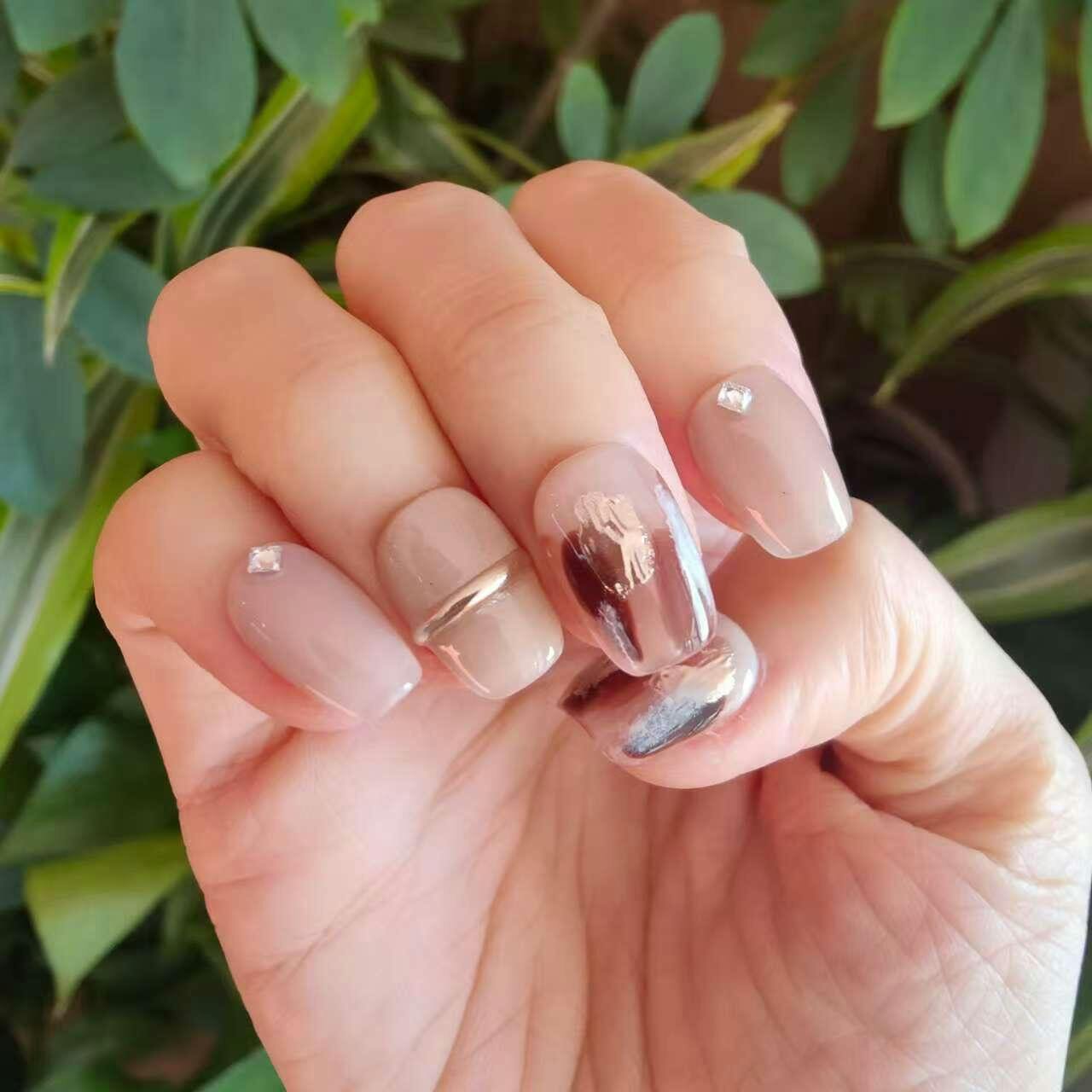 ミディアムバレリーナ|大人ニュアンスネイル|ブラウンネイル|ミラーネイル|金箔ネイル|オフィスネイル|ジェルネイルチップ