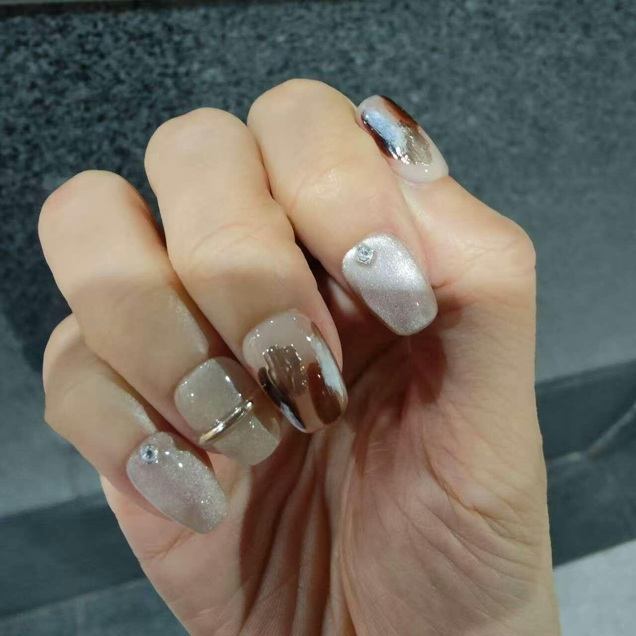 ラテを思わせるまろやかなブラウンに、金箔のきらめきとミラーの質感を少しだけ散らし、“やりすぎない大人の余裕”を意識して仕上げました。フォルムは指先が綺麗に見えるミディアムバレリーナ。短めでも長めでも自然に馴染み、手元全体をふんわり明るく見せてくれます。